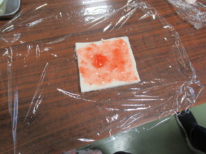 広げたラップの上にパンを置き、イチゴジャムを塗ります。