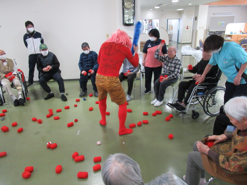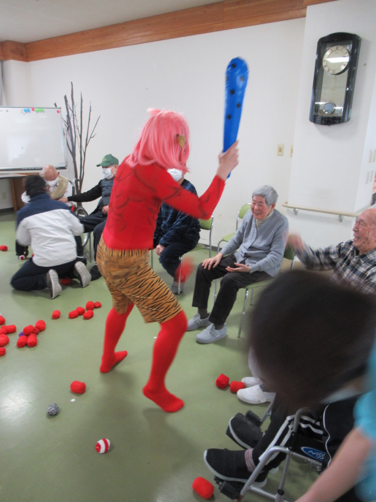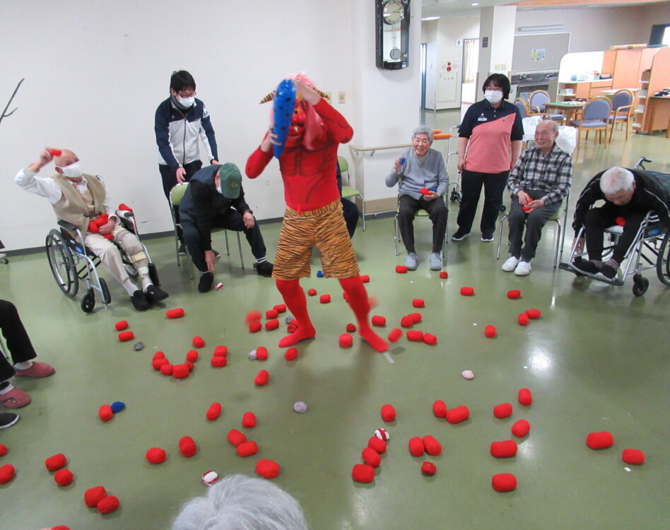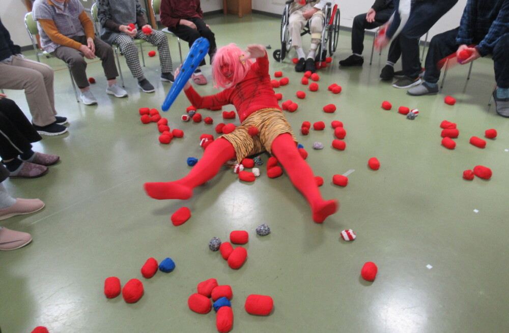 皆さん、赤鬼めがけ玉を投げます。