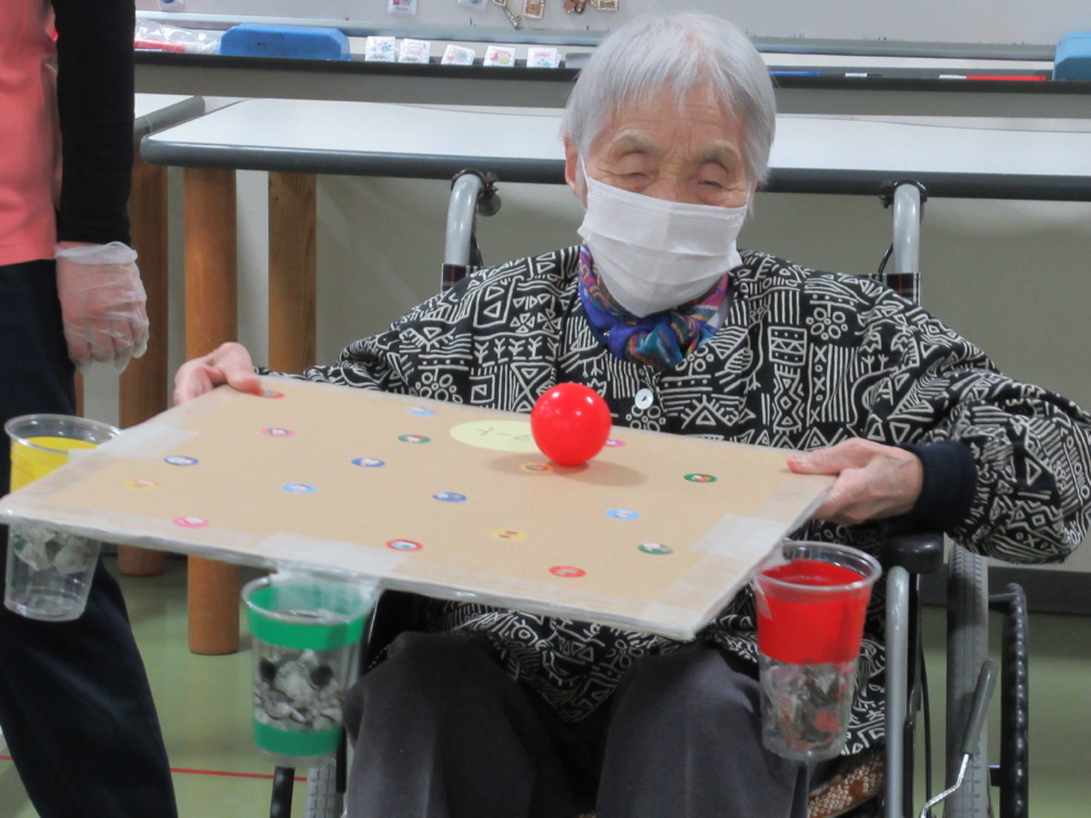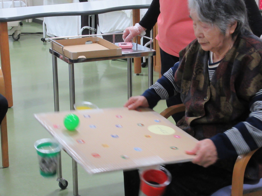 本日のレクリエーションは3色のボールを使ってカップの中に入れるゲームを行いました。