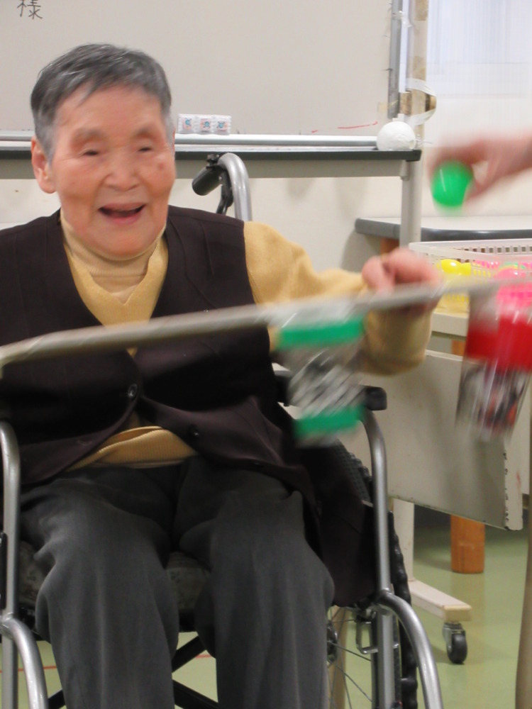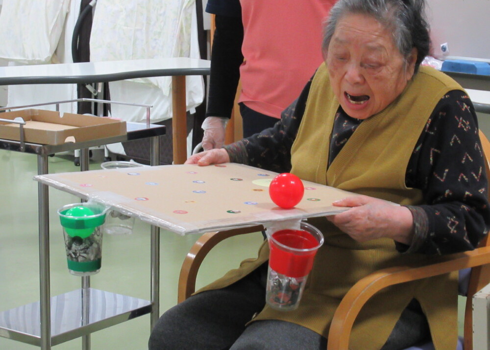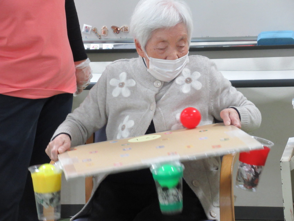 本日のレクリエーションは3色のボールを使ってカップの中に入れるゲームを行いました。