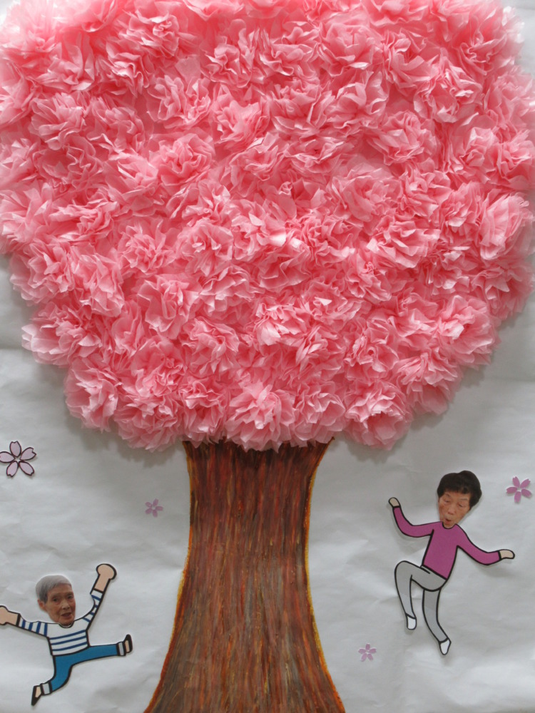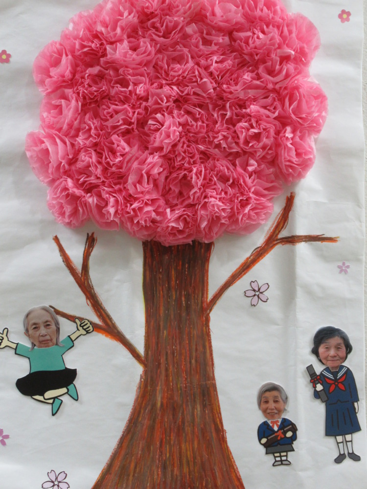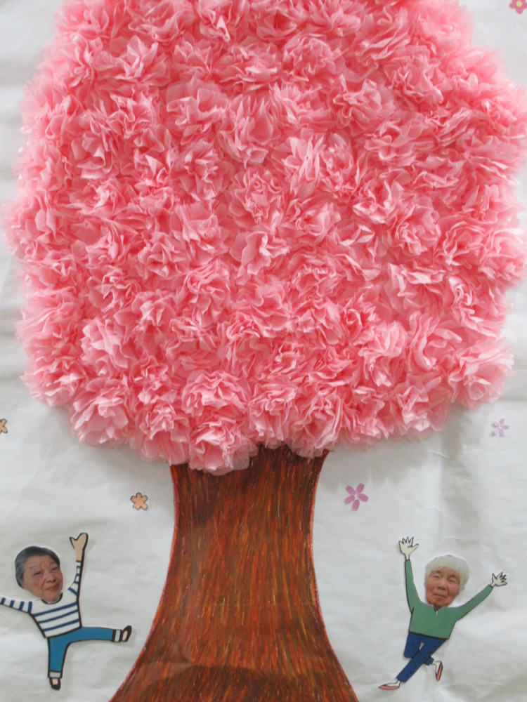 大江山園に通って来てくださっている全員の方々の顔写真を切り取り色々なパターンの服装に貼り合わせ、卒業式シーン、入学式シーン、ブルーシートを広げてのお花見シーンを展示しています。