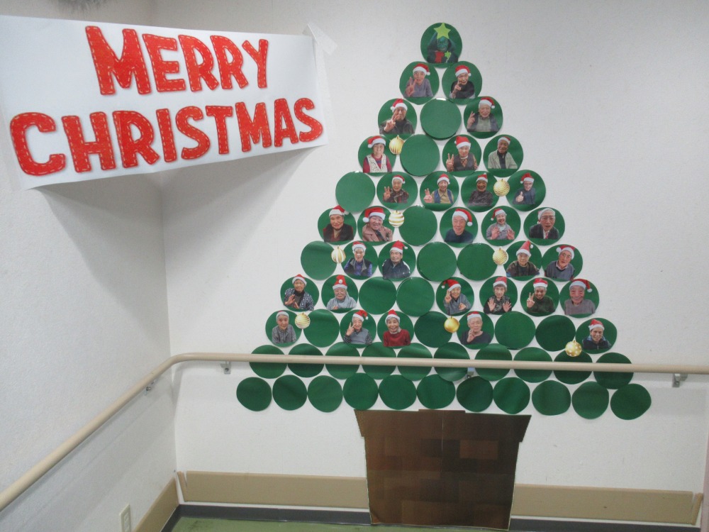 今年、デイケアでは利用者さんのサンタさん写真でツリーを作成しました🌟 皆さんのキラキラ輝く笑顔で、…